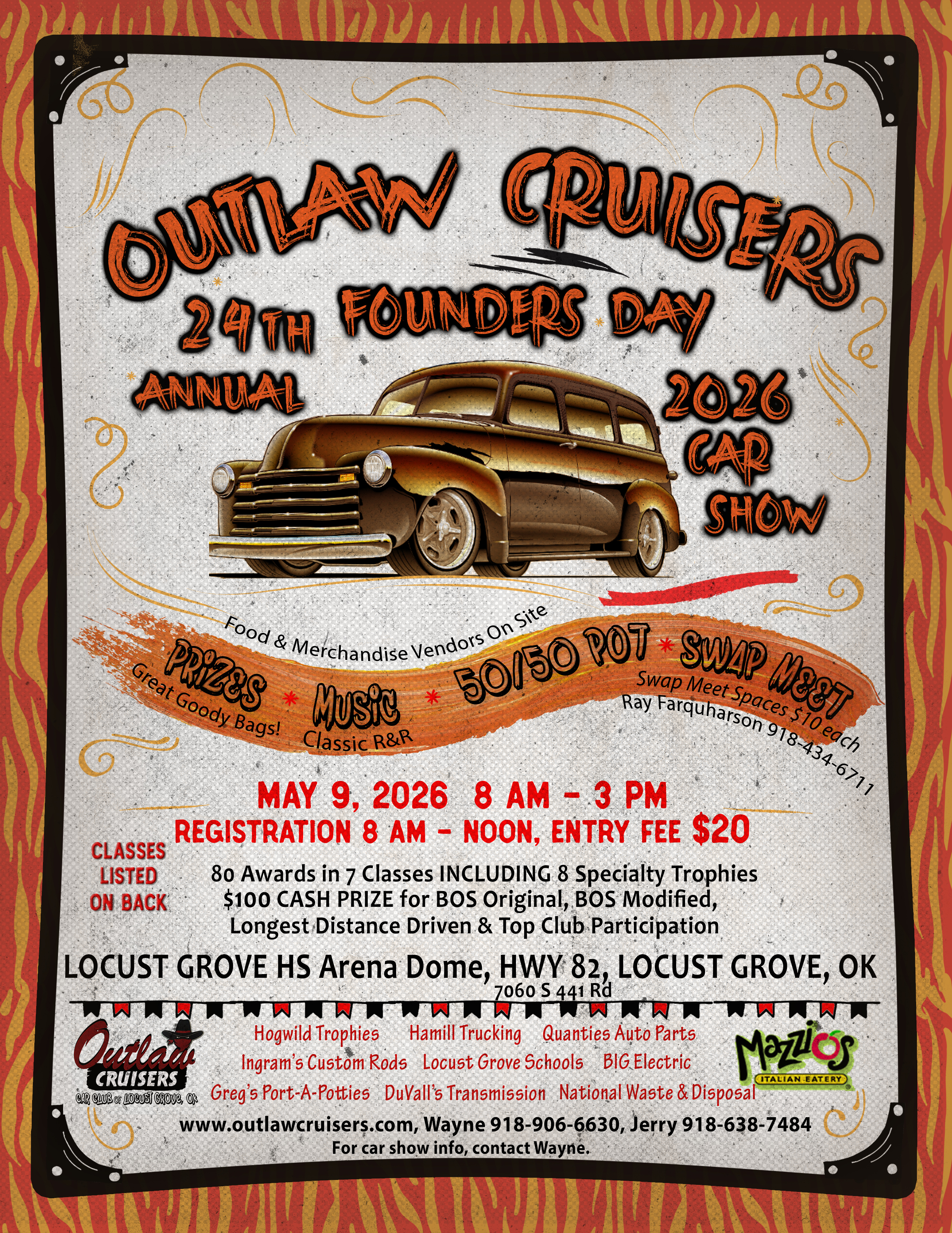 2026 Founders Day 2026 Founders Day Car Show Classes 80 Plaques or Trophies + Cash Prizes: TOP 40 – CARS 1900-1990 TOP 10 – TRUCK’S 1900-1990 TOP 10 – CARS 1991-PRESENT TOP 5 – TRUCKS 1991-PRESENT TOP TEEN TOP 2 – RATROD TOP 3 – UNFINISHED PLUS SPECIALTY AWARDS FOR: SUPERINTENDENT’S CHOICE TURNER’S LP GAS CHOICE BIG ELECTRIC CHOICE $100 LONGEST DISTANCE $100 TOP CLUB PARTICIPATION BEST PAINT BEST INTERIOR BEST ENGINE $100 BEST IN SHOW-ORIGINAL $100 BEST IN SHOW-MODIFIED Share this: Share on X (Opens in new window) X Share on Facebook (Opens in new window) Facebook Like Loading...