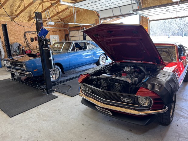 Right: Jim Cole’s 1984 Chevy PU; Doyle Cole’s 1970 Ford Mustang Mach I; Wayne Cole’s 1969 GMC PU.