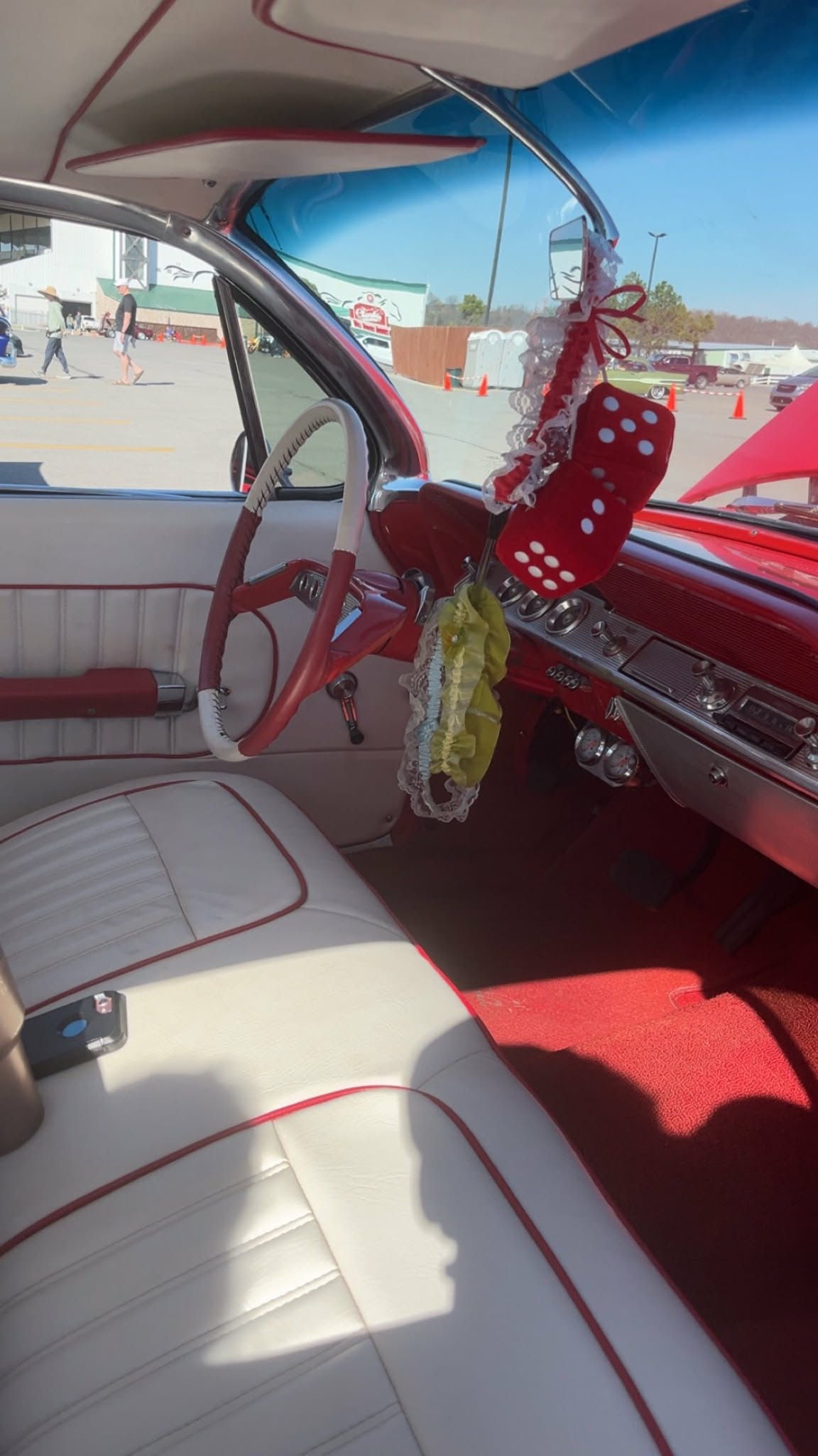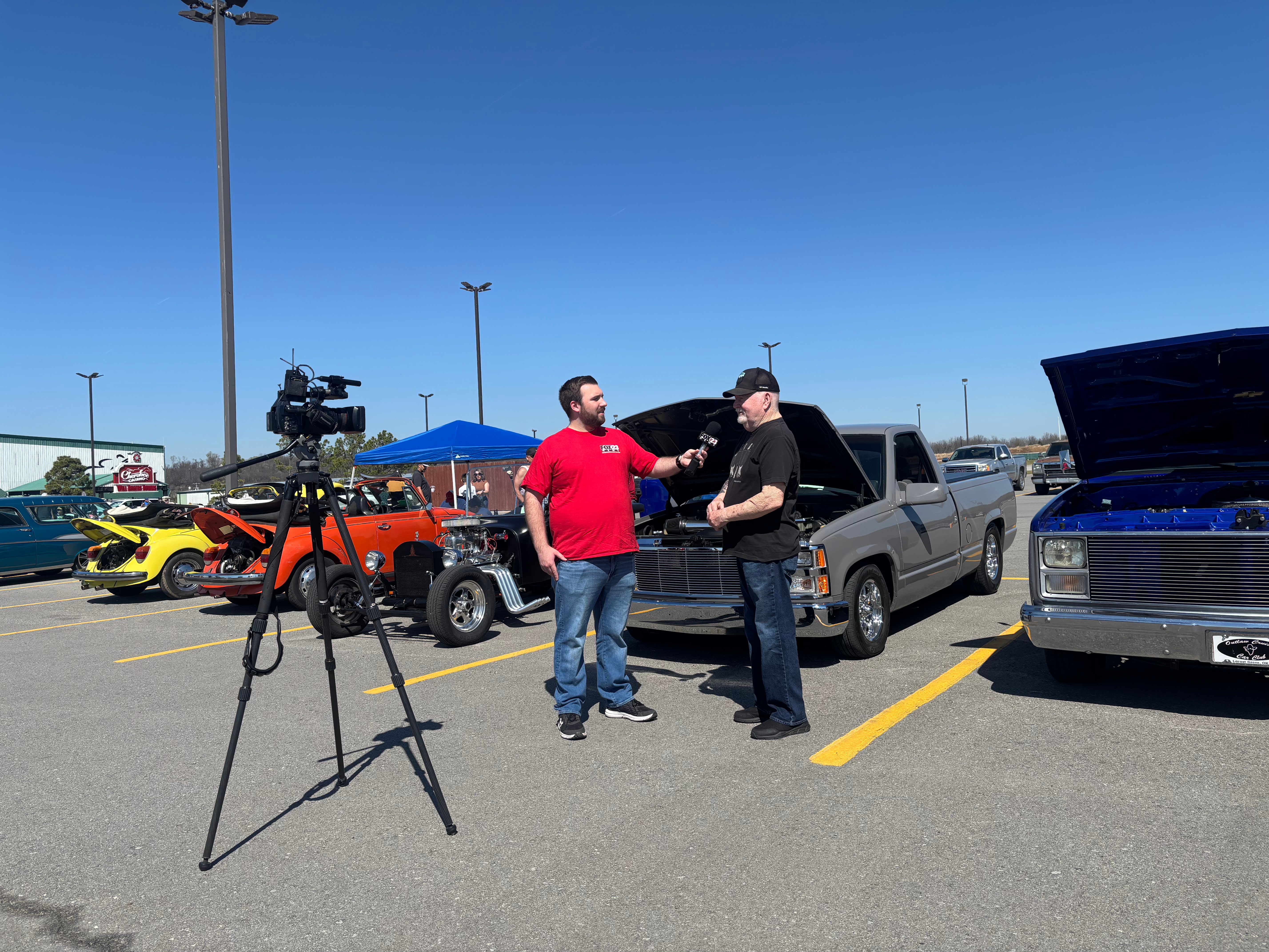 The rescheduled show at Claremore Casino had 76 entries. Visiting members that came to donate but did not enter their cars were Chris Elliott-’69 Super Bee, Darrell Murray and son Nic-’69 Dodge Coronet, Donna Plumlee-’57 Chevy and Mark Hayes-’85 Silverado. Just visiting without their car were Bill and Cindy Foreman. Members with car entries were Heather Early-’73 Yellow VW, Hailee Clark-’74 Orange VW with her father John Clark, Jim Cole-‘84 Chevy PU, Doyle Cole-‘70 Mustang, David DeCamp-‘23 T Bucket, Christy DeCamp-‘89 Chevy PU, Robert Thompson-‘68 Camaro, Drew Stott-2011 Chevy Vette, Skip McDowell-‘91 Chevy S10, the only TOP 20 winner Todd Boney-‘87 Buick Regal, Dennis Felts-‘57 Chevy wagon and ‘38 Chevy driven by daughter Stephanie and ‘55 Chevy driven by Grandson Cameron with his wife Emily and kids Sophia, Gunner and Lynnlee, Charley Scott-‘67 Mustang, Terry Hardcastle-‘61 Chevy Impala and the only one Doyle didn’t get a picture of. Sorry Terry. To the left is the interior of Terry’s Impala; and the last picture is Terry being interviewed by Fox23 (submitted by Christy DeCamp). See the video by clicking HERE (and wait for the ad to finish). Several members and members’ cars were featured. The other photos were submitted by Doyle Cole. Thank you Doyle.